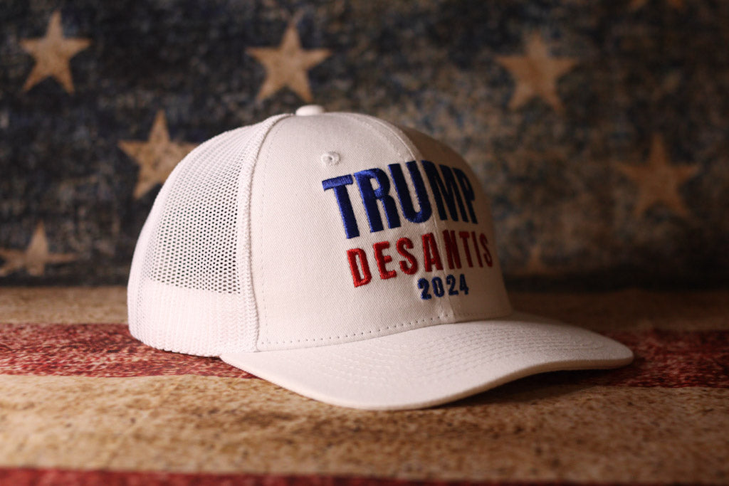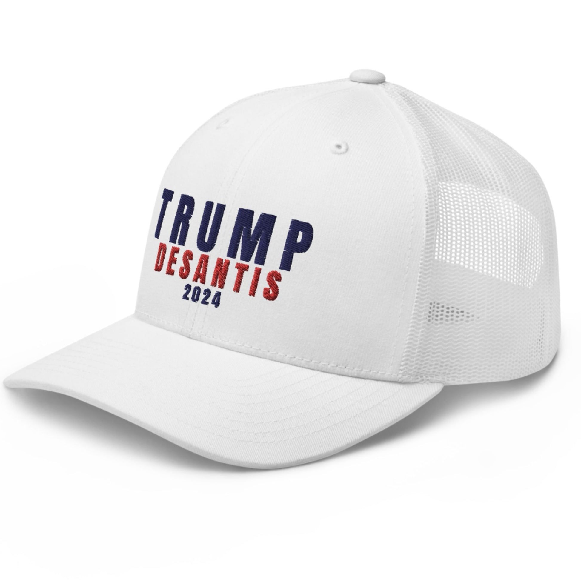 - Donald Trump Ron DeSantis for President 2024 MAGA Adjustable Trucker Hat! Perfect for any President Trump and Ron DeSantis fan, this very high-quality hat is printed and shipped from the USA, unlike cheap hats you see for sale that are imported from China. Makes a perfect gift or addition to your own collection! Original design in Red and Navy embroidered on the front.