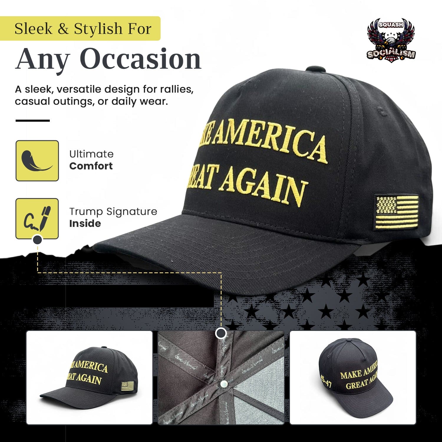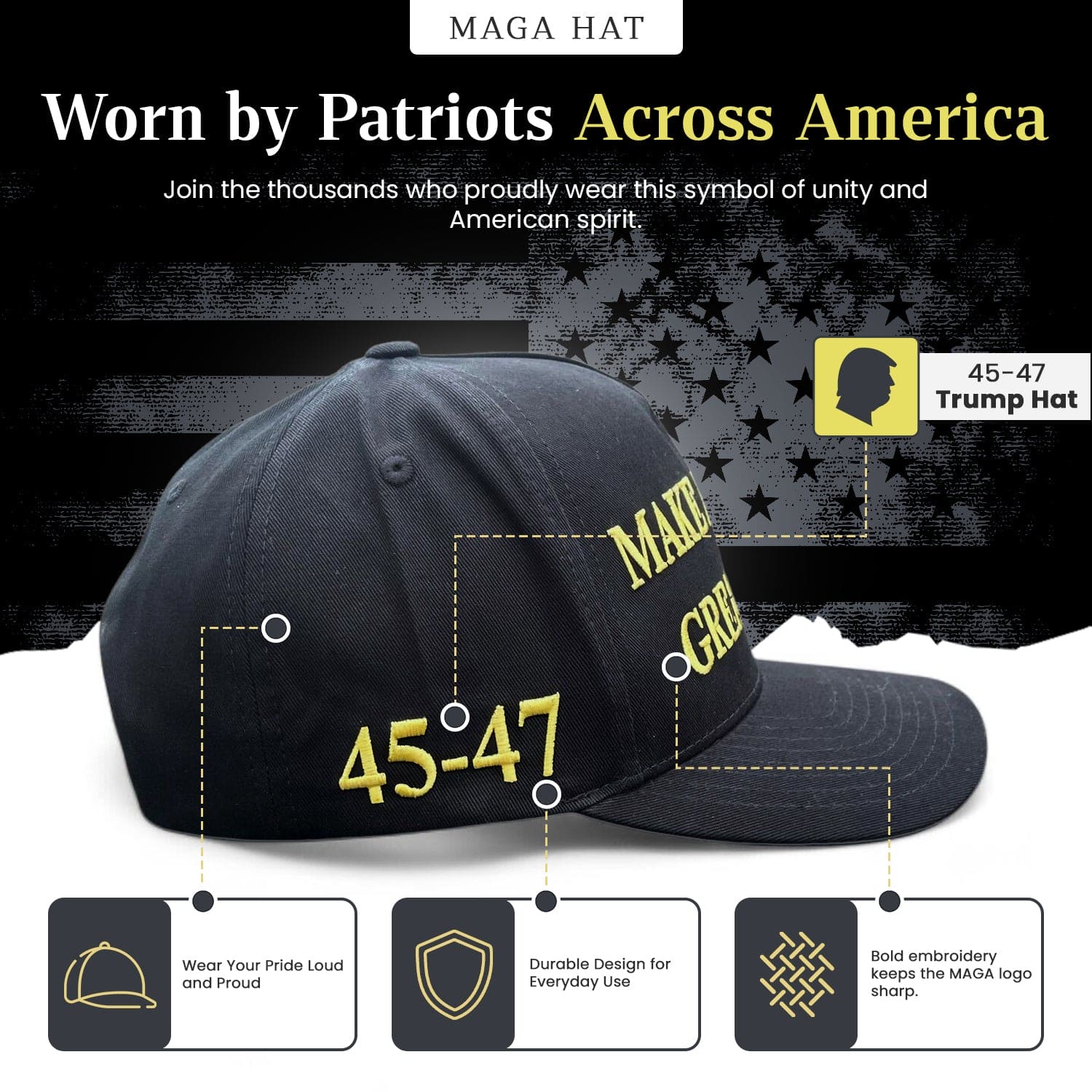 This Make America Great Again snapback hat features a tall embroidered front, Trump's signature on the lining, and 45-47 and USA flag on the sides. With a snapback closure, you can adjust to your perfect fit. Show your support for President Trump with this stylish and iconic hat.